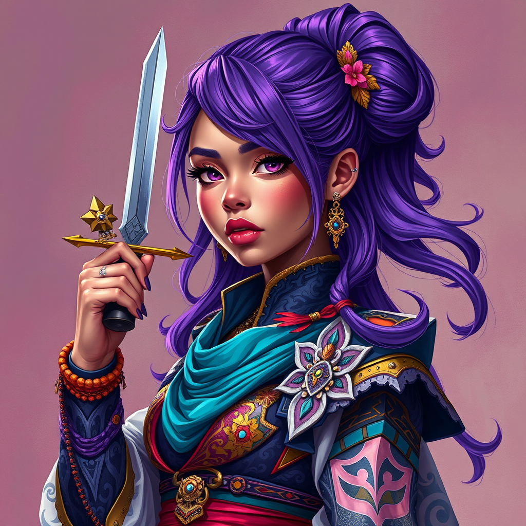 A young woman with purple hair and an intricate, colorful outfit, holding a dagger with a confident stance, inspired by vibrant afrofuturism and Rossdraws' cartoon aesthetic, featuring a palette of striking and lush colors. The digital painting demonstrates a mix of vibrant realism and hyper-realistic details with a vivid and imaginative composition. The artwork's stunning style incorporates rich, dark tones alongside pastel hues to create a beautifully dynamic and captivating piece.