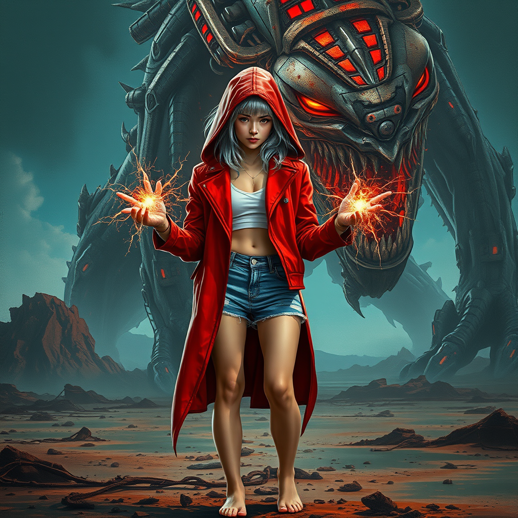 A young woman with shimmering silver hair peeks from beneath the hood of a chic crimson jacket. She is dressed in denim shorts and stands barefoot, facing off against a colossal monster in a post-apocalyptic landscape. Strange energy pulses from her hands, casting an eerie glow over the scene. The hyperdetailed painting captures the essence of luminism and octane render techniques, featuring complex bioluminescent details and fractal isometrics. The artwork, inspired by the styles of Martina Fačková, Prywinko Art, Artgerm, WLOP, Alphonse Mucha, Tony Taka, and Erté, is rendered in stunning 8k resolution. It presents a hyperrealistic portrait with bright, gritty textures, evoking the dramatic intensity of a cinematic scene reminiscent of Da Vinci's intricate sketches. The rough sketch utilizes a mix of bold, dark lines and loose strokes, all penned on paper to portray a lifelike human representation. This concept art offers a spellbinding blend of realism and fantasy, creating a vivid, dynamic cover image rich in detail and color.