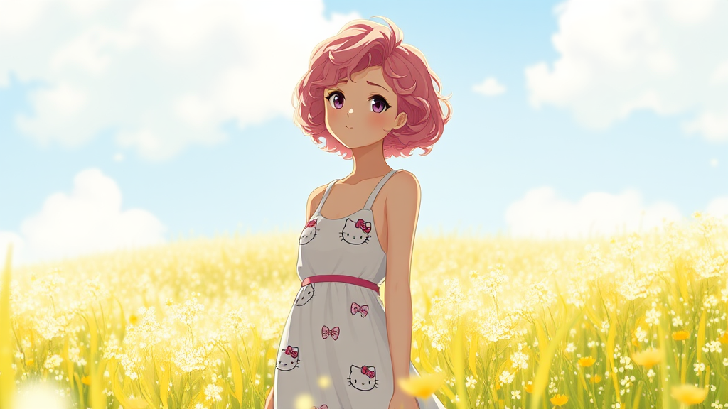 A young woman with short, curly pink and blonde hair stands gracefully in a sun-dappled meadow, surrounded by gentle breezes. She wears a playful dress adorned with subtle Hello Kitty motifs, blending seamlessly into the idyllic landscape. Her relaxed pose exudes a serene confidence, capturing the tranquil essence of the scene. Rendered in exquisite 5k detail, this image is imbued with the enchanting charm and whimsy of a Studio Ghibli world, evoking a sense of joy and wonder with its vivid colors and delicate artistry.