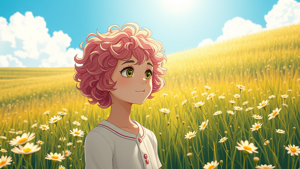 A young woman with short, curly pink and blonde hair stands in a serene meadow, her spirit playful and carefree. With a hint of Hello Kitty charm, she embodies a whimsical innocence. The landscape is lush and detailed, akin to a Studio Ghibli masterpiece, capturing a warm and tranquil atmosphere. She is surrounded by gently swaying wildflowers beneath a clear blue sky, as the sun bathes everything in a soft, golden light. Her eyes reflect a sense of wonder and adventure, harmonizing with the peaceful yet enchanting scene around her.