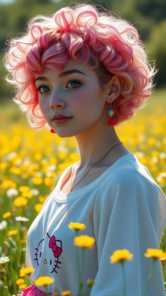 A young woman with short, curly pink and blonde hair stands in a sunlit meadow, her appearance reminiscent of a Studio Ghibli character. The scene is relaxed and detailed, capturing her serene expression as she admires the field around her. Playful elements of Hello Kitty can be seen in her accessories and clothing, adding a whimsical touch to the tranquil setting. The vibrant landscape and soft natural light create a dreamy atmosphere, highlighting the harmony between nature and her unique style.