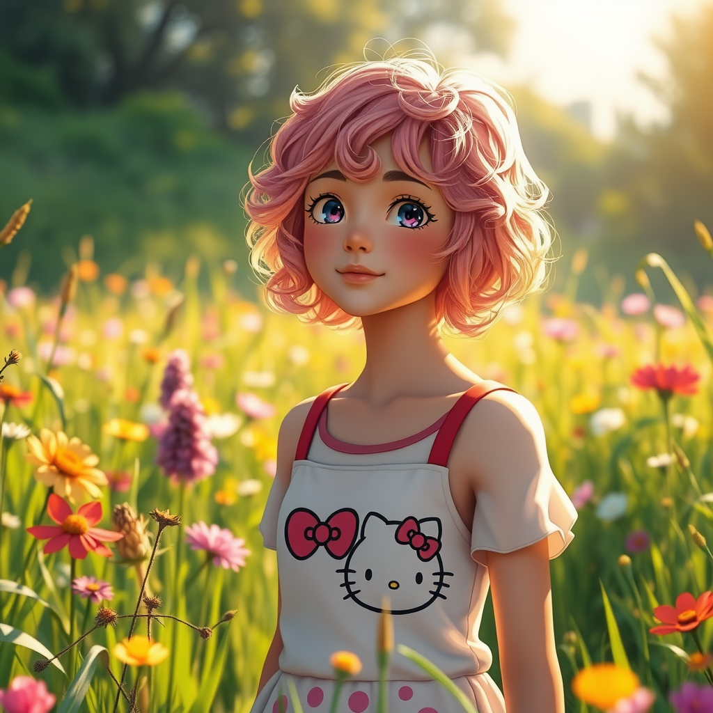 A young woman with short, curly pink and blonde hair stands in a lush, sunlit meadow, surrounded by whimsical flowers. She wears a playful outfit featuring a Hello Kitty design, her expression relaxed and serene. The scene, reminiscent of a Studio Ghibli film, is incredibly detailed with vibrant colors, capturing the gentle sway of grass in the breeze and the warmth of a golden afternoon. The atmosphere feels enchanted and dreamlike, with every element harmoniously blending into a serene and picturesque landscape.