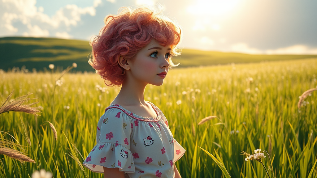 A young woman with short, curly pink and blonde hair stands in a serene meadow, a gentle breeze rustling the grass around her. Her attire subtly reflects the charm of Hello Kitty, blending whimsical patterns with a touch of playful elegance. The scene is captured in exquisite detail, reminiscent of a Studio Ghibli film, where each element is lovingly rendered to evoke a sense of tranquility and wonder. Soft sunlight filters through the clouds, casting a warm glow over the landscape, enhancing the peaceful, idyllic atmosphere.