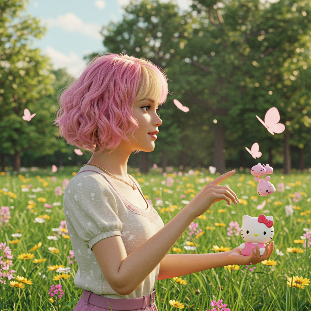 A young woman with short, curly pink and blonde hair stands serenely in a sunlit meadow, surrounded by wildflowers and butterflies. She wears a light-hearted expression as she interacts playfully with Hello Kitty-themed elements. The scene is rendered in exquisite detail, capturing a whimsical, peaceful atmosphere reminiscent of a Studio Ghibli film, with vivid colors and soft lighting enhancing the natural beauty of the landscape.