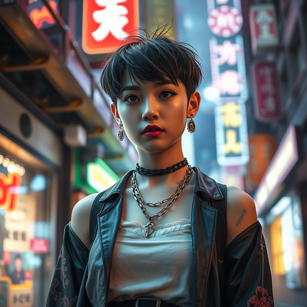 A young woman with short, edgy hair stands confidently in a bustling cityscape, illuminated by the vibrant glow of neon storefronts. Her attire reflects the eclectic blend of cult party kei style, showcasing layers of quirky and whimsical fashion. The scene is captured in the style of a hyper-detailed, realistic portrait reminiscent of genre paintings with an alienpunk twist. The interplay of light and color adds a surreal element, casting vivid reflections and shadows that dance across her features. The photograph, taken with precision reminiscent of Ivan Marchuk’s intricate artistry, is shot using a Fujifilm X-T4 and a Sony FE 85mm f/1.4 GM lens, ensuring a richly detailed and raw aesthetic that captures the mood and essence of this futuristic urban setting.