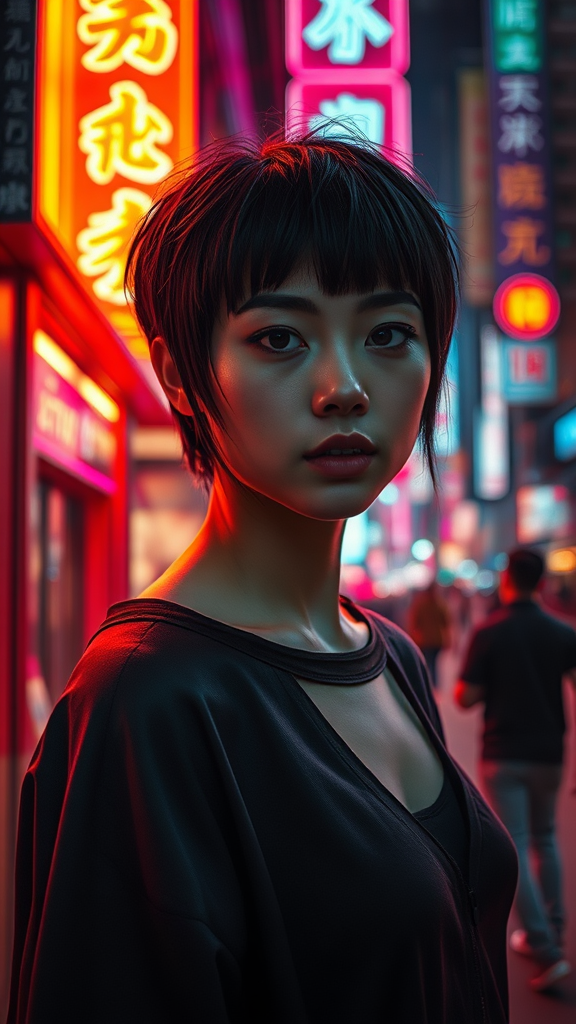A young woman with short hair stands in a bustling city, illuminated by the glowing neon lights of a storefront. The scene is captured with hyper-realistic detail, blending elements of cult party kei fashion and richly detailed genre paintings with a hint of alienpunk. The vibrant interplay of light and color creates a captivating atmosphere, reminiscent of the works of Ivan Marchuk. Shot with a Fujifilm X-T4 and a Sony FE 85mm f/1.4 GM lens, the portrait showcases a raw and authentic style, emphasizing the textures and hues that make the cityscape come alive at night.
