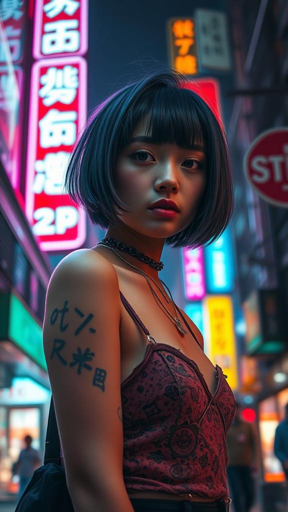 A young woman with short hair stands in a bustling cityscape, illuminated by the glow of neon lights from a nearby store. Her appearance blends the whimsical, layered aesthetics of cult party kei with the futuristic elements of alienpunk. The scene is a hyper-detailed and richly textured portrait, reminiscent of genre paintings, capturing the depth of interplay between vivid light and shadow. The artwork evokes the styles of Ivan Marchuk, emphasizing intricate details and vibrant colors. Photographed in a style akin to that of a Fujifilm X-T4 paired with a Sony FE 85mm f/1.4 GM lens, the image is captured in a raw, unfiltered manner, highlighting the vivid realism and atmospheric density of the moment.