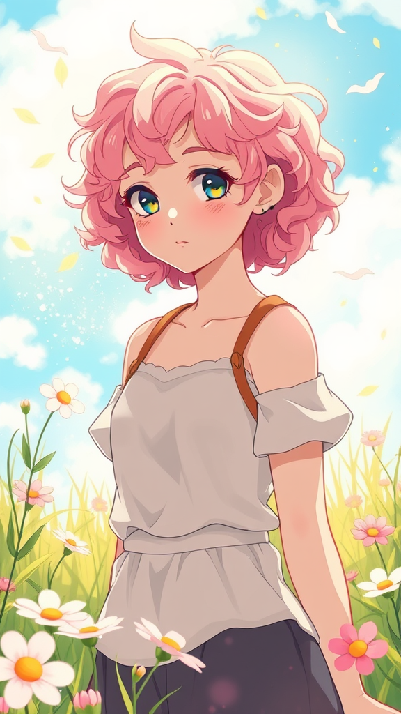A young woman with short, pink and blonde curly hair, stands gracefully in a vibrant meadow, surrounded by whimsical flowers and gentle breezes, embodying a serene and relaxed atmosphere. She is adorned in attire influenced by a Hello Kitty aesthetic, blending charm with subtle elegance. The scene is depicted with intricate detail and vividness, reminiscent of a Studio Ghibli animation, capturing the enchanting harmony between nature and character in a highly detailed, captivating portrayal.
