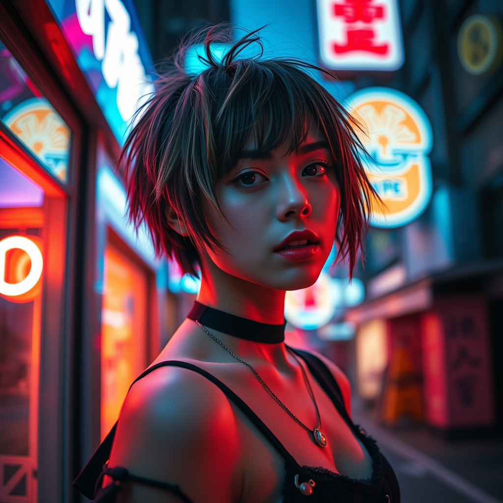 A young woman with short, tousled hair stands poised in an urban landscape, her figure illuminated by the vibrant glow of a neon-lit storefront. Her attire, a blend of whimsical and avant-garde, embodies the essence of cult party kei. The scene exudes elements of alienpunk, as futuristic motifs intertwine effortlessly with the vivid city backdrop. An interplay of light and color casts dynamic shadows across her features, reminiscent of Ivan Marchuk's style and captured with the precision of a Fujifilm X-T4. The lens, a Sony FE 85mm f/1.4 GM, enhances the richness and detail, bringing a hyper-realistic quality to the portrait. The scene is structured in a compelling 3:4 aspect ratio, evoking a raw, immersive aesthetic that draws the viewer into its richly detailed world.