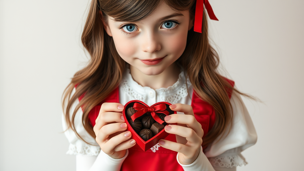 A young woman with silky brown hair and sparkling blue eyes stands timidly, her cheeks dusted with a rosy blush. She holds a heart-shaped box of chocolates carefully in both hands, offering it as a sweet gift. Her attire consists of a charming red apron over a delicate white blouse adorned with lace trim, tied together with a black ribbon. A vibrant red headband adorns her hair, adding a playful touch to her appearance. Her outfit is completed with white thigh-high stockings, giving her an air of innocence and charm.