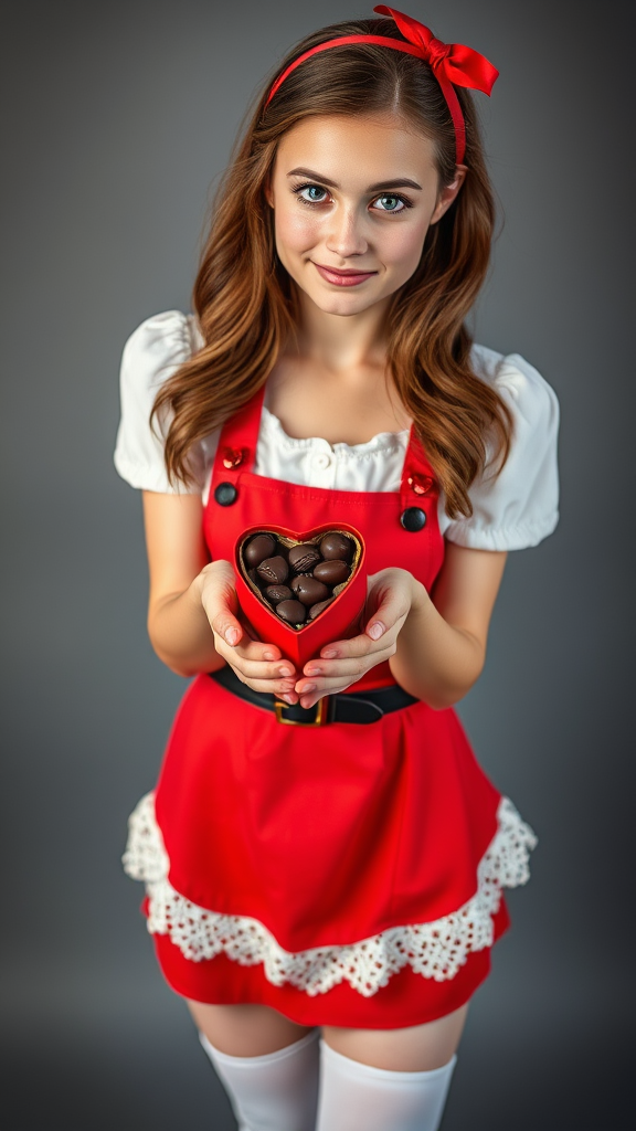 A young woman with soft brown hair and captivating blue eyes stands, her cheeks slightly flushed with a shy expression. She holds out a heart-shaped box of chocolates with both hands, offering the sweet gift with a gentle sincerity. Her outfit is charming and festive: a red apron adorned with delicate lace edges drapes over a crisp white blouse, accented by a playful black belt. A vibrant red headband keeps her hair neatly in place, complementing her attire. Below, white thigh-high stockings add a touch of elegance to her look, completing her heartfelt presentation.