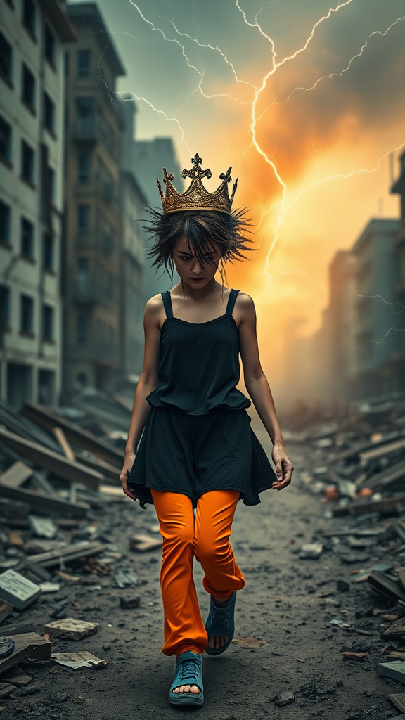 A young woman with spiked hair and a determined expression walks towards the viewer amidst the remnants of a destroyed city. Her black dress top is juxtaposed with vibrant orange pants and striking blue footwear. A tarnished crown rests atop her head, tears streaming down her face as flickers of electricity crackle around her, a visible aura of anger and sorrow. The air is thick with the remnants of her ruined karma, adding depth to the intricate details of her forlorn yet powerful stance.