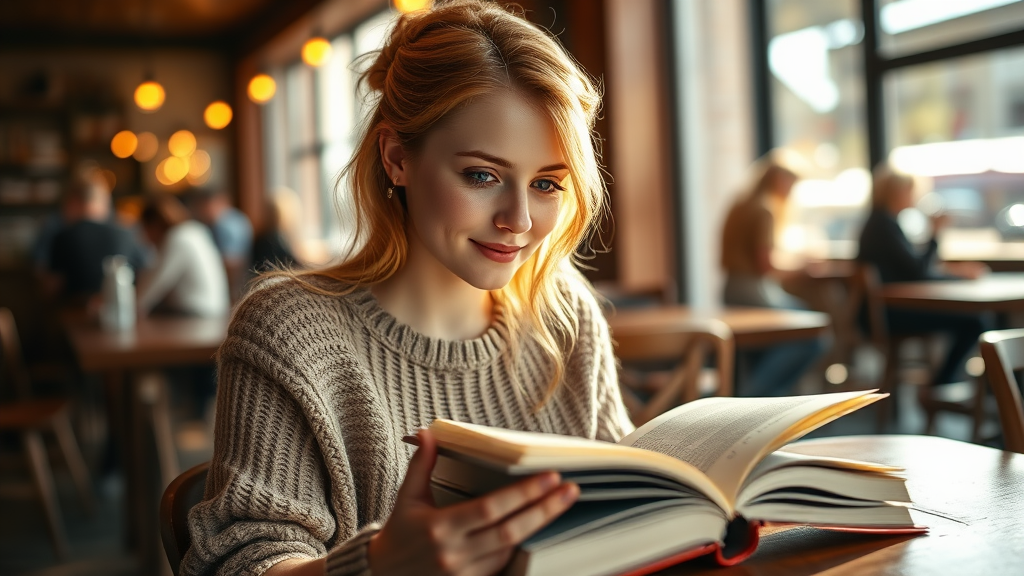 A young woman with strawberry blonde hair sits at a cozy wooden table in a sun-drenched coffee shop, her blue eyes focused intently on the pages of a novel, a slight smile of fascination on her lips. Her soft wool sweater casts gentle shadows under the warm cinematic lighting filtering through the large window. The depth of field captured by a high-resolution DSLR lens creates a creamy bokeh effect, blurring the bustling background while highlighting her contemplative expression and the inviting atmosphere of the serene café.