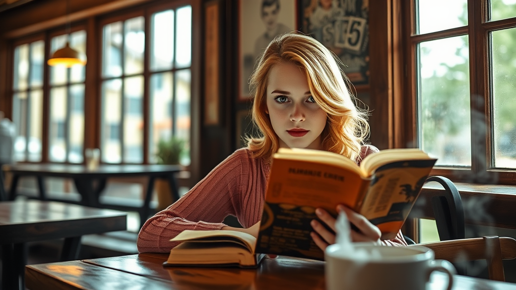 A young woman with strawberry blonde hair, sitting at a rustic wooden table near the window of a cozy coffee shop, reading a classic novel, her eyes wide with intrigue, sunlight filtering through the window casting cinematic shadows, a DSLR captures the scene in photorealistic detail, the ambiance warm and inviting, hints of steaming coffee in the foreground.