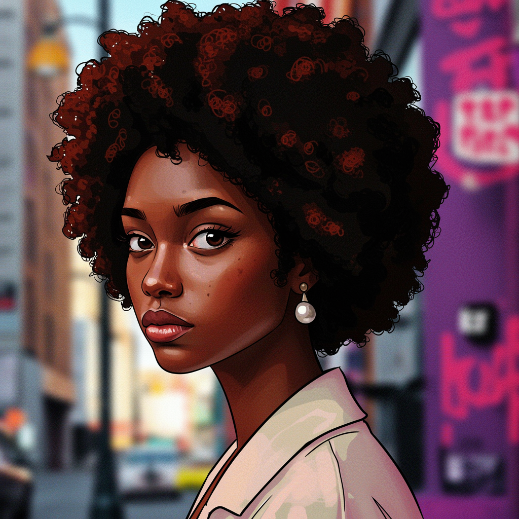 A young woman with striking afrocentric features, adorned with a single elegant pearl earring, set against a vibrant urban backdrop. Her expressive eyes convey a sense of mystery and strength, reminiscent of Aaron McGruder's bold and dynamic character designs. The scene captures the essence of modernity infused with timeless beauty, the colors vivid and the lines sharp, reflecting a fusion of classic elegance and contemporary street art style.
