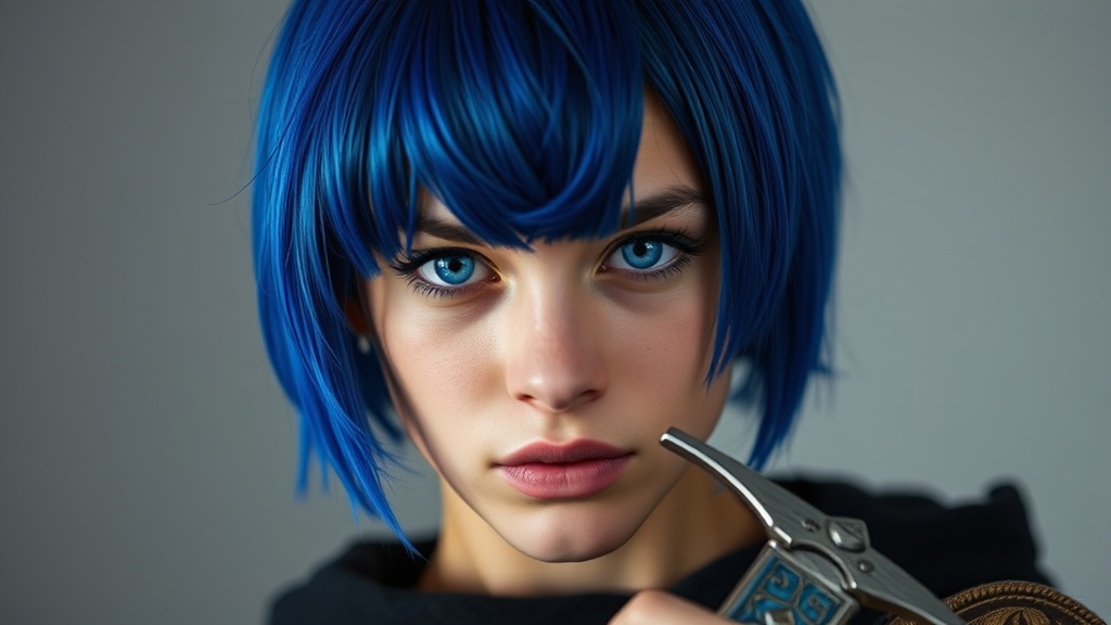 A young woman with striking cobalt blue hair cut short, her eyes mirroring the same vivid hue. Clutched in her hand is an elegantly crafted sword, its blade shimmering with a faint luminescent glow.
