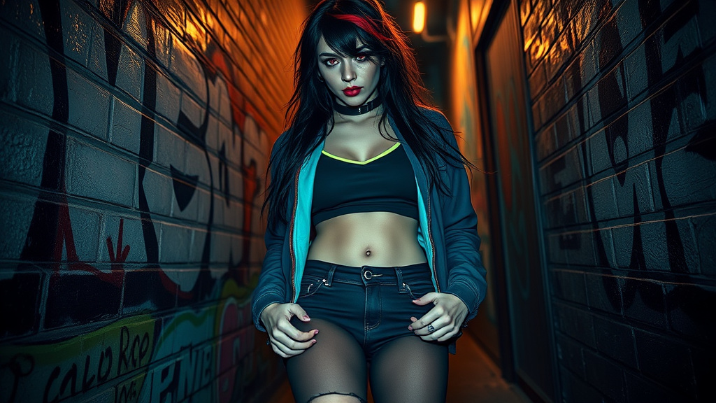 A young woman with striking features stands confidently against a brick wall adorned with vibrant graffiti. Her thick thighs, emphasized by the sheer black pantyhose, convey strength and allure. Her long, black hair is artfully messy, with red highlights cascading through, partially covering her sharp red eyes which seem to pierce through the dimly lit alley. She wears a choker and a neon shirt beneath an open jacket, exuding a sense of rebellious style. Her torn legwear adds an edgy touch to her ensemble. The dim lighting casts subtle shadows, creating an atmospheric backdrop for this intriguing character. The mix of intricate details and chromatic aberrations imbues the scene with an artistic, almost painted quality, capturing the essence of urban street art.