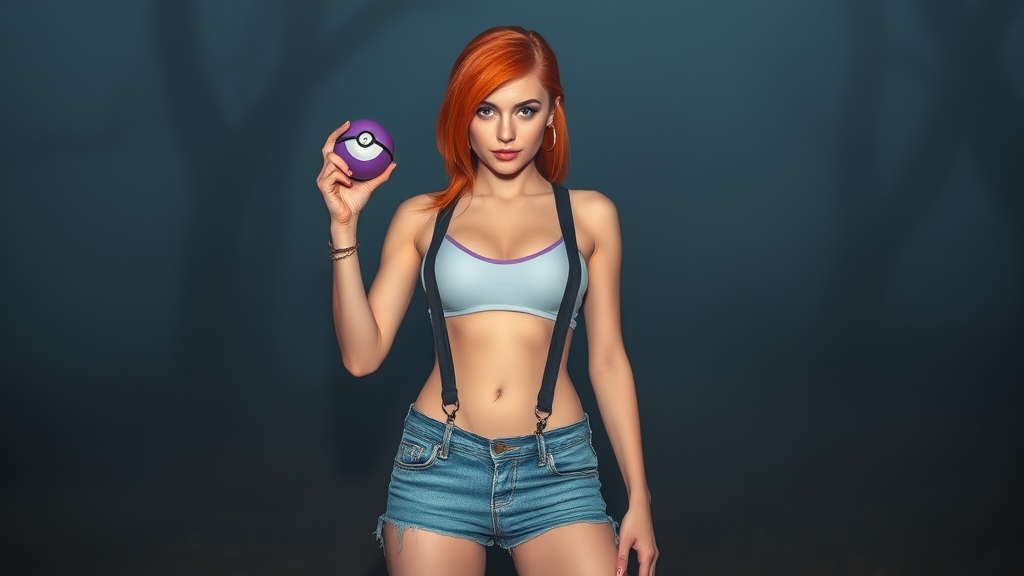 A young woman with striking orange hair, reminiscent of Misty from Pokémon, stands confidently, holding a pokeball in her hand. The scene is set in a mysterious, foggy environment. She's wearing a snug tank top paired with suspenders, accentuating her athletic frame. Her low-waisted jean shorts and thong hint at her daring style, while her busty figure and midriff are subtly highlighted. Her playful and determined expression adds to her vibrant and adventurous persona.