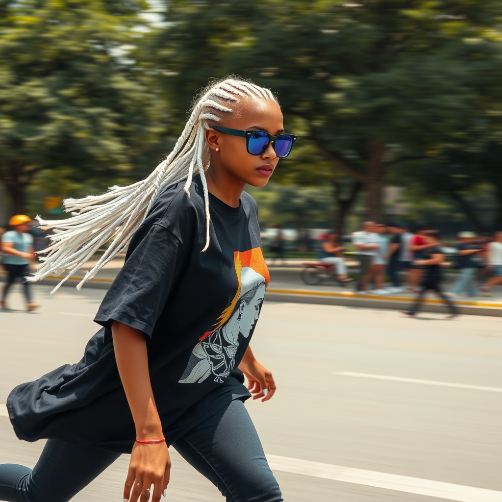 A young woman with striking platinum white braided hair is captured gliding effortlessly on a skateboard through a bustling city park. She's wearing oversized reflective sunglasses and a trendy oversized black T-shirt with abstract art printed on it. The sun glistens on her hair, adding a touch of ethereal glow to the scene. Trees blur in the background as she speeds past, her focus unwavering. Photographed in stunning detail with an 8K resolution using a Canon EOS-1D camera at f/5, the image is so realistic it feels like you could step right into the vibrant, dynamic scene.