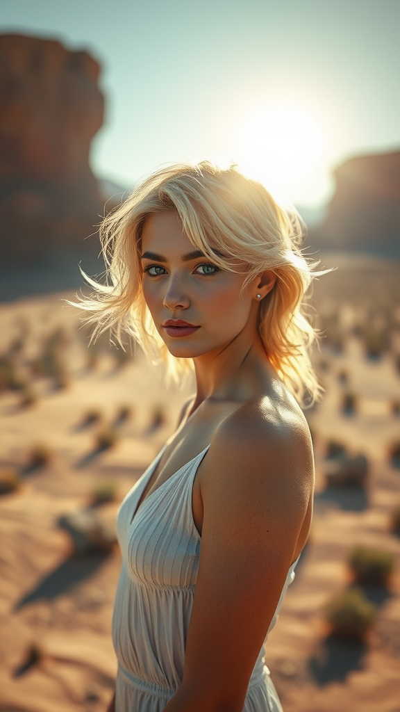 A young woman with sunlit blonde hair stands poised against a sprawling desert backdrop. Her presence exudes a futuristic aura, captured through an ultra-realistic lens, showcasing intricate details and a cinematic play of light and shadow. The scene is carefully focused through an 85mm lens with a depth of field that enhances her ethereal demeanor. The artistry draws inspiration from masters like Artgerm, Greg Rutkowski, and Alphonse Mucha, blending a concept rich in hyperrealism with a touch of oil paint’s smooth textures. Despite the surreal charm, there's a subtle distortion akin to an artistic exploration of altered proportions and playful variations in anatomy, lending an imaginative twist to the visual narrative. The encounter hints at a sun-kissed tan, with the desert sun rendering a gentle sunburn effect across her complexion, all enveloped in an 8k clarity that reveals every layer of the intricate tableau.