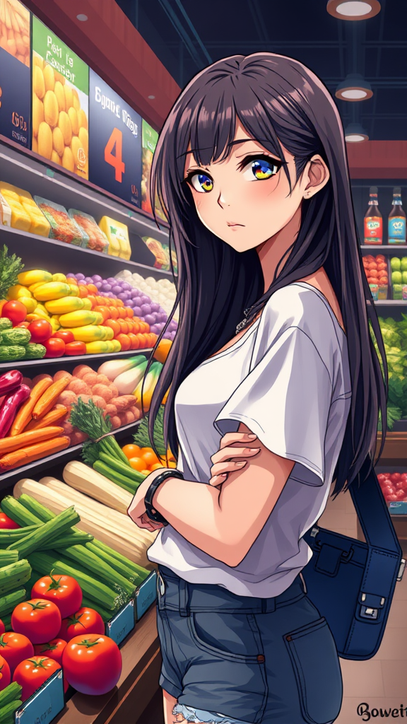 A young woman with vibrant, expressive eyes stands thoughtfully in front of a colorful produce section, carefully selecting fresh vegetables. She's dressed in a trendy urban outfit, exuding a stylish confidence as her long hair cascades down her back. The scene is captured in a captivating digital illustration that merges the detailed, atmospheric style of Guweiz with the dynamic, vibrant flair of Bowater. The anime-style artwork breathes life into the supermarket setting, where each fruit and vegetable is rendered with care, creating a harmonious blend of everyday routine and artistic elegance.
