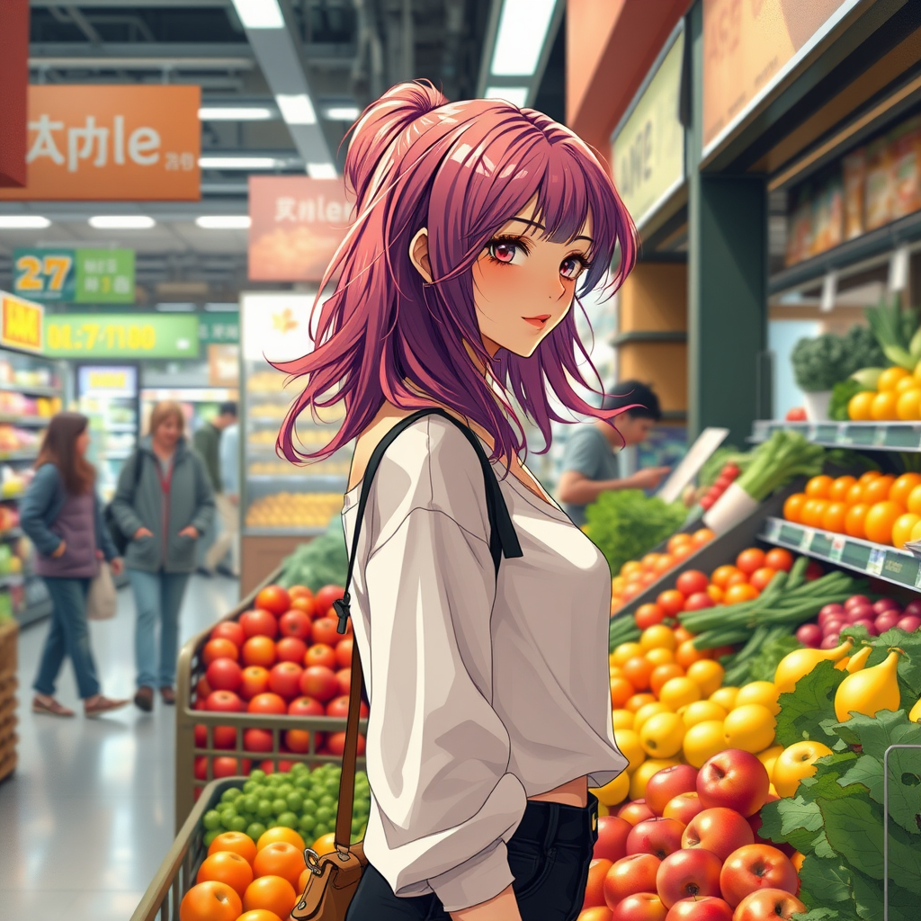 A young woman with vibrant, flowing hair stands gracefully in front of the produce section, her eyes scanning the colorful array of fruits and vegetables. She is dressed in a chic, urban outfit, blending modern street fashion with a hint of anime-inspired flair. The bustling supermarket surrounds her, filled with everyday shoppers, yet she stands out with her serene elegance and attention to detail. Her expression is focused and thoughtful, as if she is crafting a masterpiece from the ingredients before her. The digital illustration captures the scene with exquisite detail, infusing it with warm tones and dynamic lighting that highlight the glossy texture of apples, the leafy greens, and the soft pastel shades of her attire. Rendered in the signature styles of artists like Guweiz and Bowater, the piece combines high-quality fanart with the whimsical charm of an anime aesthetic, bringing the urban grocery experience to life through intricate brushwork and a touch of fantasy.