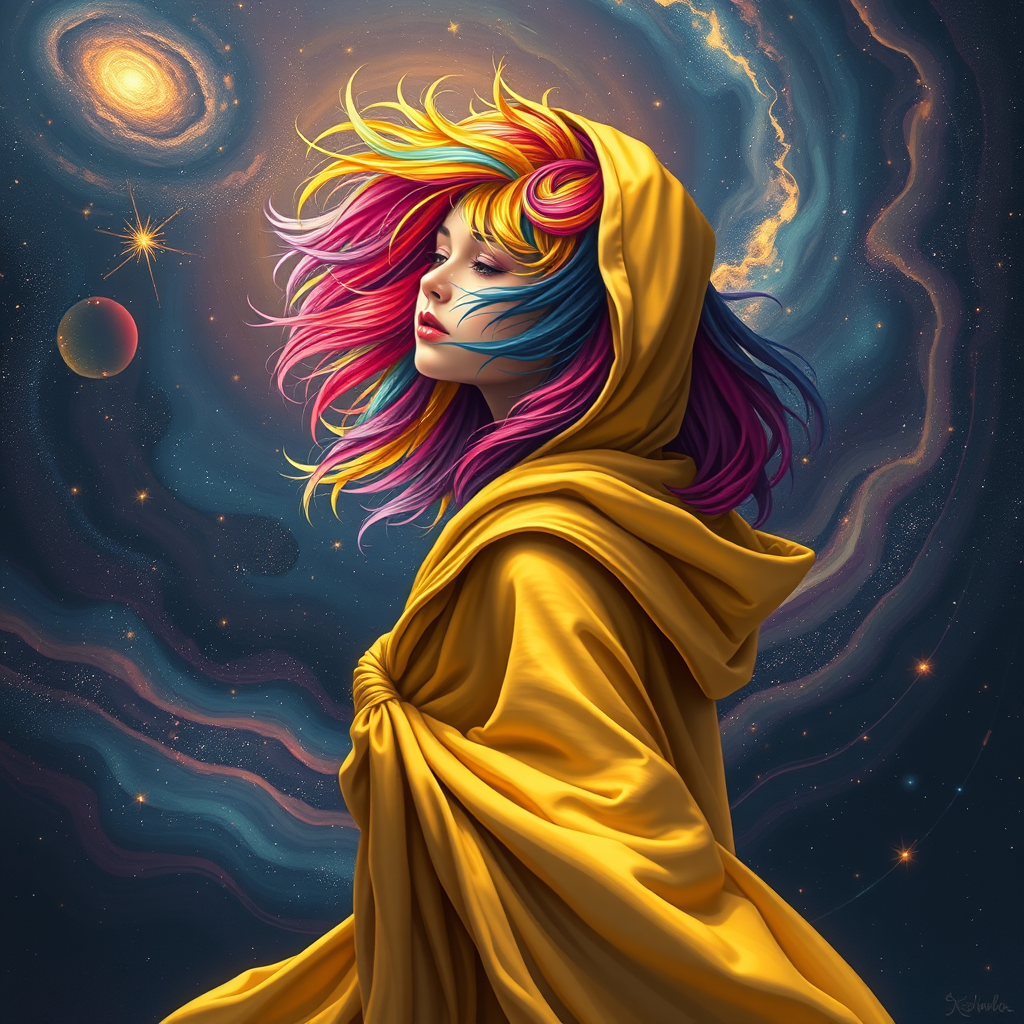 A young woman with vibrant, multicolored hair that shifts in hues like a gradient rainbow, stands amidst a vast, swirling cosmos. She is enveloped in a flowing, golden robe with a hood, reminiscent of sunlight. Around her, the universe spins in its entirety, stars twinkling and galaxies twisting in a dance of cosmic wonder.