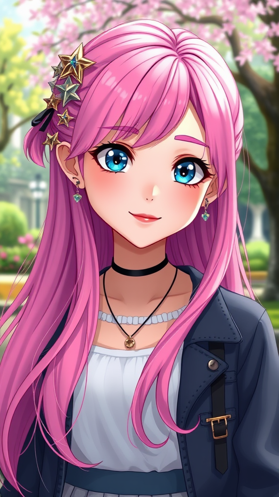 A young woman with vibrant pink hair cascading down her back is captured in an enchanting park setting, her striking blue eyes locking with the viewer’s gaze. Her delicate facial features are framed by long, detailed locks adorned with star-shaped hair ornaments. She wears elegant earrings and tasteful jewelry that complement her stylish outfit: a chic skirt and a trendy jacket. Her lips form a gentle smile, exuding warmth and charm. The detailed park background adds depth and atmosphere to the scene, with its lush greenery and soft lighting enhancing the visual narrative. Rendered in a high-definition 3D cartoon anime style, the digital art boasts vivid colors and hyperrealistic detail, reminiscent of a cinematic scene from a Studio Ghibli film. The scene is masterfully crafted with intricate textures and a big depth of field, trending on ArtStation and CGSociety for its artistic prowess.