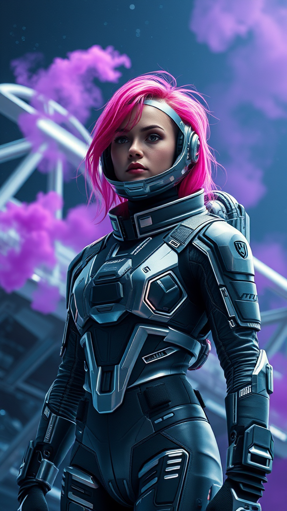 A young woman with vibrant pink hair stands tall in a futuristic space suit, surrounded by the vastness of the cosmos. Her striking figure is set against the backdrop of a sleek, advanced spaceship, its metallic structure gleaming under the soft glow of distant stars. Wisps of ethereal purple smoke swirl around her, adding an air of mystery and intrigue. The scene is captured with photorealistic clarity, bathed in cinematic light that accentuates the sharp reflections on her suit and visored helmet, all rendered with the cutting-edge technology of Unreal Engine 5. She's alone, embodying both strength and solitude in this breathtaking sci-fi tableau.