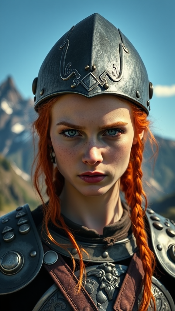 A young woman with vibrant red hair and a sprinkle of freckles gazes intensely, her eyes detailed and expressive. She wears intricately designed Viking armor, the metallic gleam catching the sunlight. Atop her head rests a traditional Viking helmet, its contours adding to her formidable presence. The landscape behind her features majestic mountains that stretch toward a clear, sunny sky, enhancing the epicness of the scene. The lighting is cinematic, casting dynamic shadows that highlight the dramatic elements of her expression and attire, creating a highly detailed and realistic portrayal that captures the strength and spirit of a young Viking warrior.