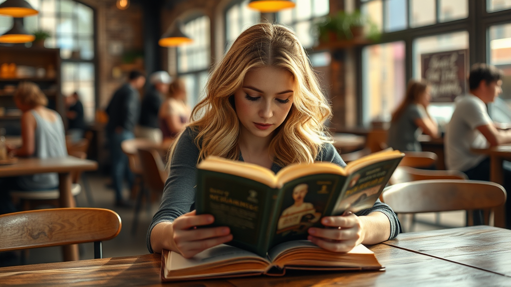 A young woman with wavy blonde hair sits at a rustic wooden table in a bustling coffee shop, her attention absorbed by a captivating book. Her eyes are bright with intrigue as she dives deeper into its pages. Natural light filters through large windows, casting a soft cinematic glow on her serene expression. The atmosphere is vibrant yet cozy, with the rich aroma of freshly brewed coffee wafting through the air, creating a perfect backdrop for this photorealistic, DSLR-captured moment.