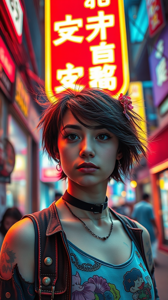 A young woman with windswept short hair stands under the vibrant glow of a neon store sign in a bustling city scene. Her attire, richly layered and eclectic, mirrors the whimsical whimsy of cult party kei style. The setting reflects alienpunk influences, with vivid, otherworldly colors creating a dynamic interplay of light and shadow across her face. Her expression is thoughtful, as if contemplating the vibrant energy around her. The scene is captured with the hyper-realistic detail of an Ivan Marchuk painting, akin to a photograph taken with a Fujifilm X-T4 and a Sony FE 85mm f/1.4 GM lens, resulting in sharp focus and beautifully rendered bokeh, immersing the viewer in a richly detailed urban narrative.
