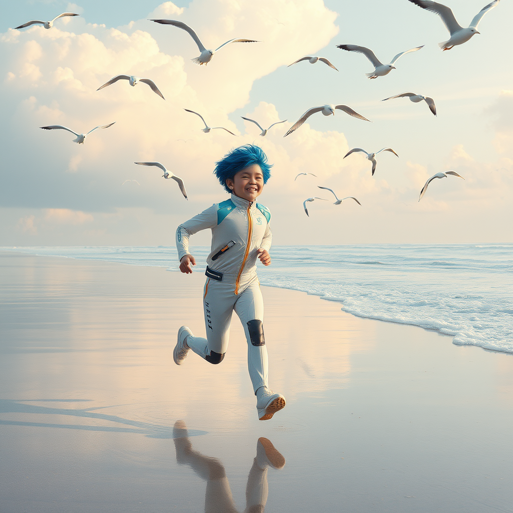 A youthful boy with vibrant blue hair, clad in an advanced, adaptive suit that seamlessly changes its design, sprints joyfully along a surreal digital shoreline. Above him, AI-directed seagulls glide gracefully in the sky, embodying a fusion of nature and technology. Evoking the style of Rinko Kawauchi, the scene captures naturalistic poses and a carefree vacation dadcore vibe. The boy's expression is both cool and spirited, set against a backdrop of cyberpunk aesthetics, where delicate flowers float amidst clouds. The imagery resonates with dreamy lo-fi photography, rich in color and reminiscent of analog film, taken on a Fujifilm XT4 camera. The landscape is depicted in super detail, emphasizing a luscious, otherworldly beachscape where technology and nature coexist in harmony.