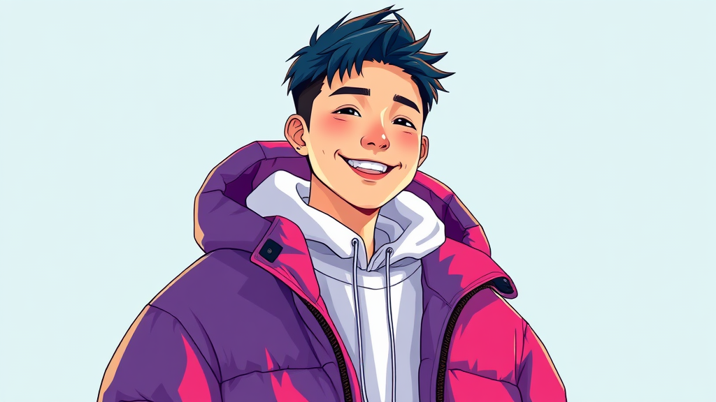 A youthful, cheerful man donned in a poncho-sized, oversized puffer jacket, reminiscent of Off-White's aesthetic, with influences drawn from Tumblr trends, styled in the manner of Yanjun Cheng. This digital art piece evokes a lofi internet meme vibe while gaining popularity on Dezeen. The image resembles a catalog photo with a 3D render flair by Beeple, incorporating elements from Rhads and Lois van Baarle. It features a vibrant cartoon-style illustration with bright colors and is a stunning artwork, capturing the retro anime essence of a man.