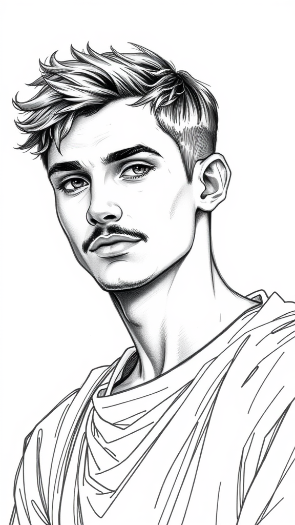 A youthful gentleman with a neatly groomed mustache and short hair, donned in a pristine white tunic, captured in the intricate black and grey sketch style reminiscent of Da Vinci, set against a clean white backdrop, with subtle artistic enhancements lending a slightly contemporary flair while honoring the classical essence.