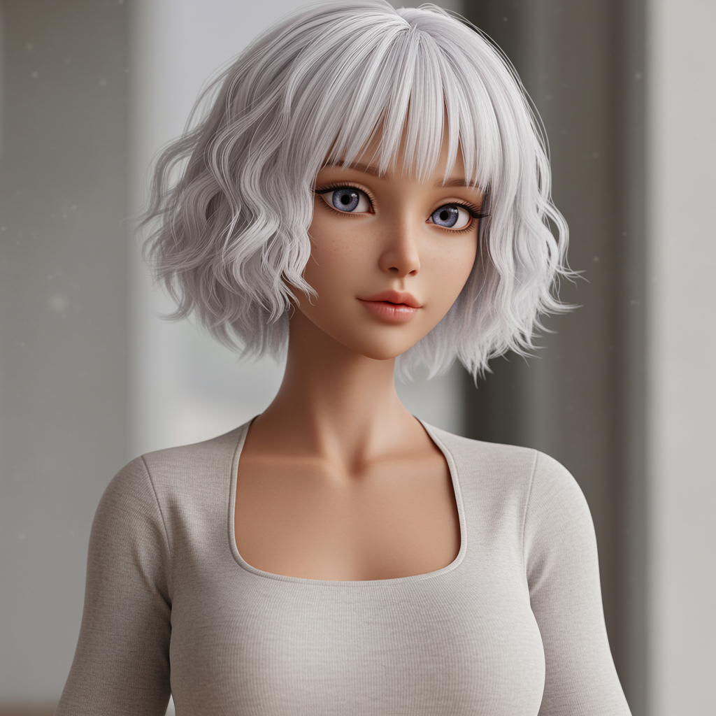 A youthful Japanese beauty with a striking combination of short, wavy, white hair styled with bangs poses gracefully for a picture. Her delicate, porcelain-like skin is beautifully offset by its light brown tone, reminiscent of a Wang Wu painting. Her youthful charm and doll-like features evoke the elegant aesthetic of a Dollfie Dream figure. Captured in a realistic anime art style, the scene embodies a kawaii elegance that would be a stunning feature on CG Society.