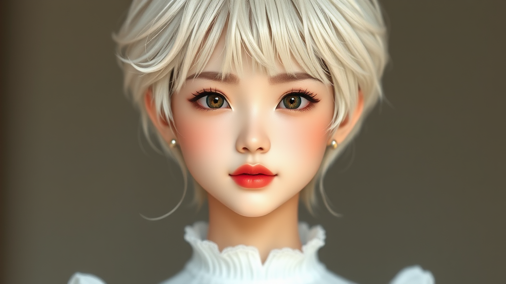 A youthful Japanese beauty with porcelain-like skin and a light brown complexion poses for a picture. Her hair is a unique fusion of short, wavy white strands and blonde bangs, styled in a way that exudes a kawaii aesthetic. Inspired by the works of Wang Wu and Dollfie Dream, her appearance blends realism with an anime art style, reminiscent of a doll's delicate features. Her enchanting presence exudes grace and elegance, making her a perfect subject for a feature on CG Society.