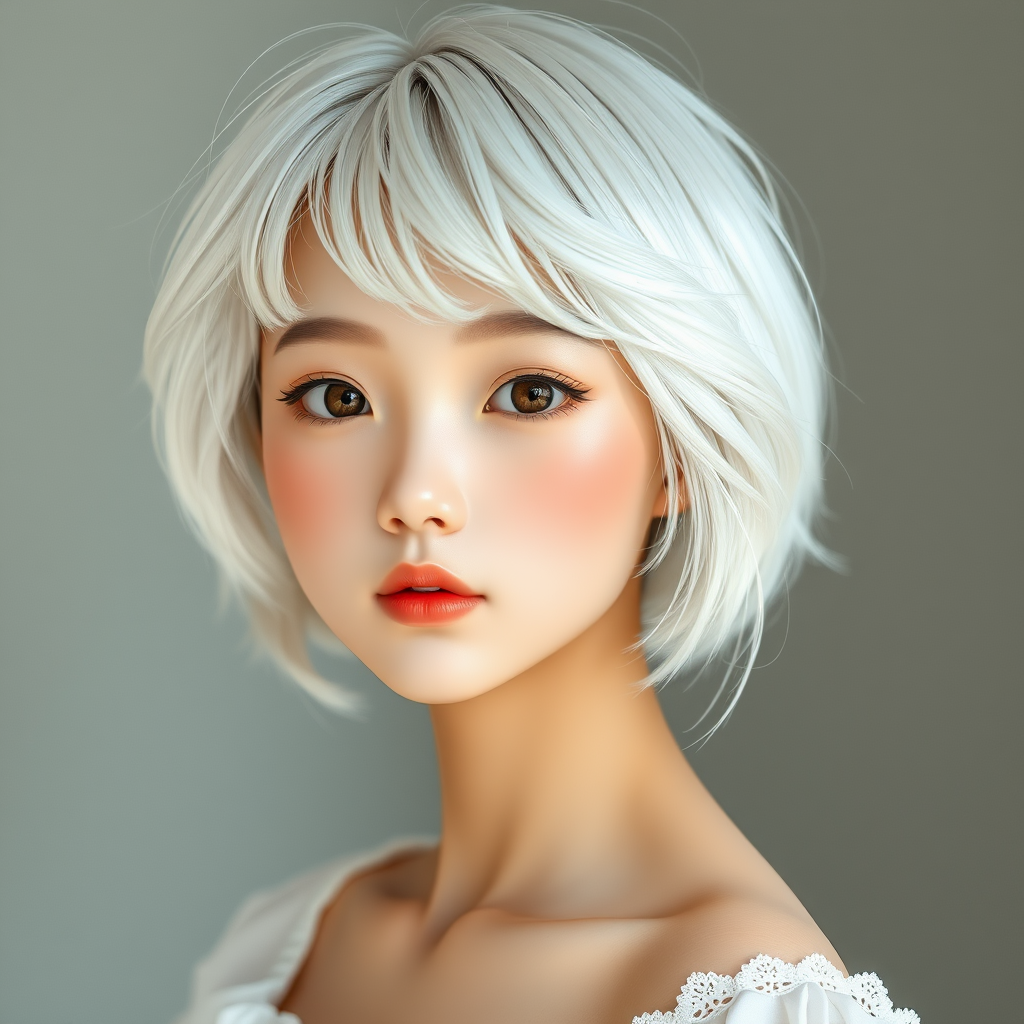 A youthful Japanese beauty with striking white hair poses for a picture, capturing the essence of a realistic anime art style. Her porcelain-like skin, light brown in tone, radiates a dollfie dream aesthetic. The hair is short, wavy at the top, featuring playful bangs in a soft pastel blonde, adding a kawaii charm to her look. Inspired by Wang Wu, her features are delicate, with an aura of ethereal grace. Set against a backdrop worthy of cg society, her enchanting presence is both captivating and serene.