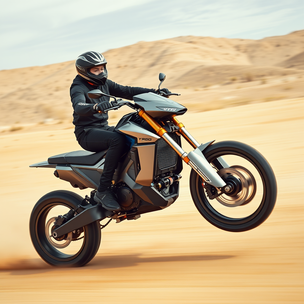 A youthful male rider on an electric dirt bike surges across the desert landscape, clad in sleek black apparel. He commands a luxurious silver and gold futuristic bike, executing a dramatic wheelie that accentuates the dynamic motion. Captured from a low angle in an expansive wide shot, the scene embodies the essence of contemporary modernist photography. The high-speed action is intensified by motion blur, rendered in stunning 8k UHD detail. The mood is enhanced by atmospheric lighting and a professional color grade, delivering a striking and immersive visual with a airy, engaging presence.
