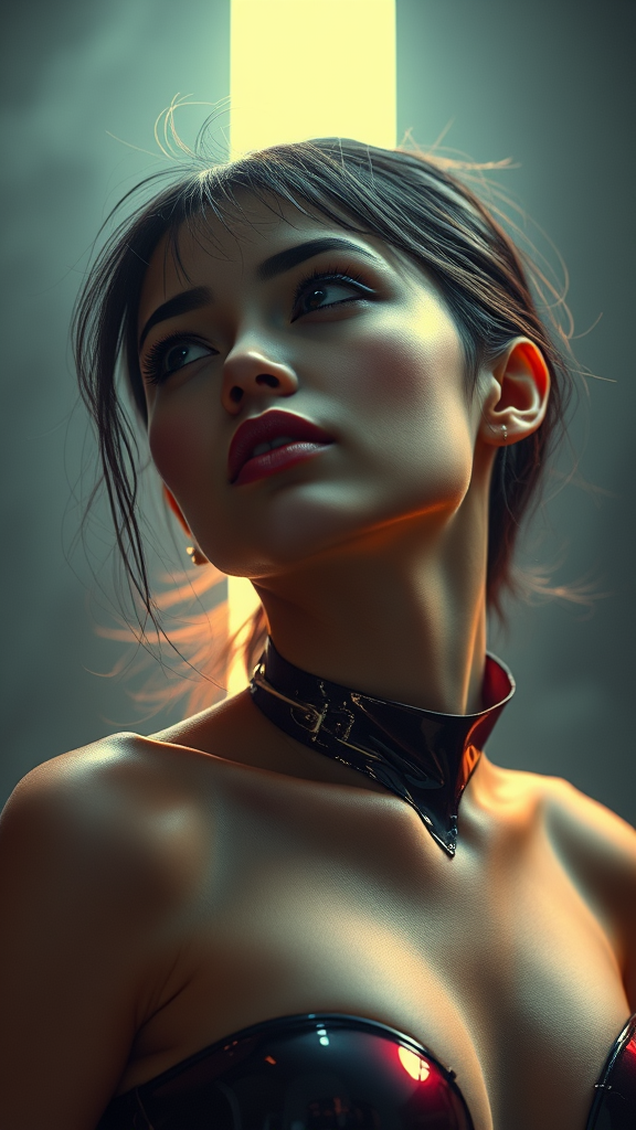 A youthful woman clad in shimmering latex gazes intently towards a radiant light, her form characterized by smooth curves and sharp, angular features. The scene captures an intriguing blend of dark, explosive elements intertwined with a sense of mystic academia, akin to goblin lore. The glossy, polished texture of her attire reflects the flickering luminescence, embodying the essence of poolcore aesthetics. Her silhouette is a harmonious play of contrasts, merging the bold and the subtle, while the composition exudes a vibrant yet mysterious allure, reminiscent of Sandara Tang's artistic style.