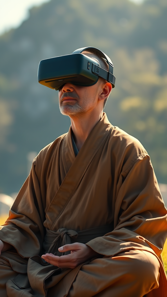 A zen monk in deep meditation, seated in a tranquil outdoor setting bathed in bright sunlight, wearing traditional zen robes and a futuristic VR headset. The scene is rendered in an 8k, photo-realistic oil painting style, reminiscent of the combined artistry of Greg Rutowski, Yoshitoshi, and Studio Ghibli. The monk's serene expression reflects a harmonious blend of ancient wisdom and modern technology. The composition features highly detailed textures and dramatic cinematic lighting, capturing the essence of peace and innovation in a single captivating image.