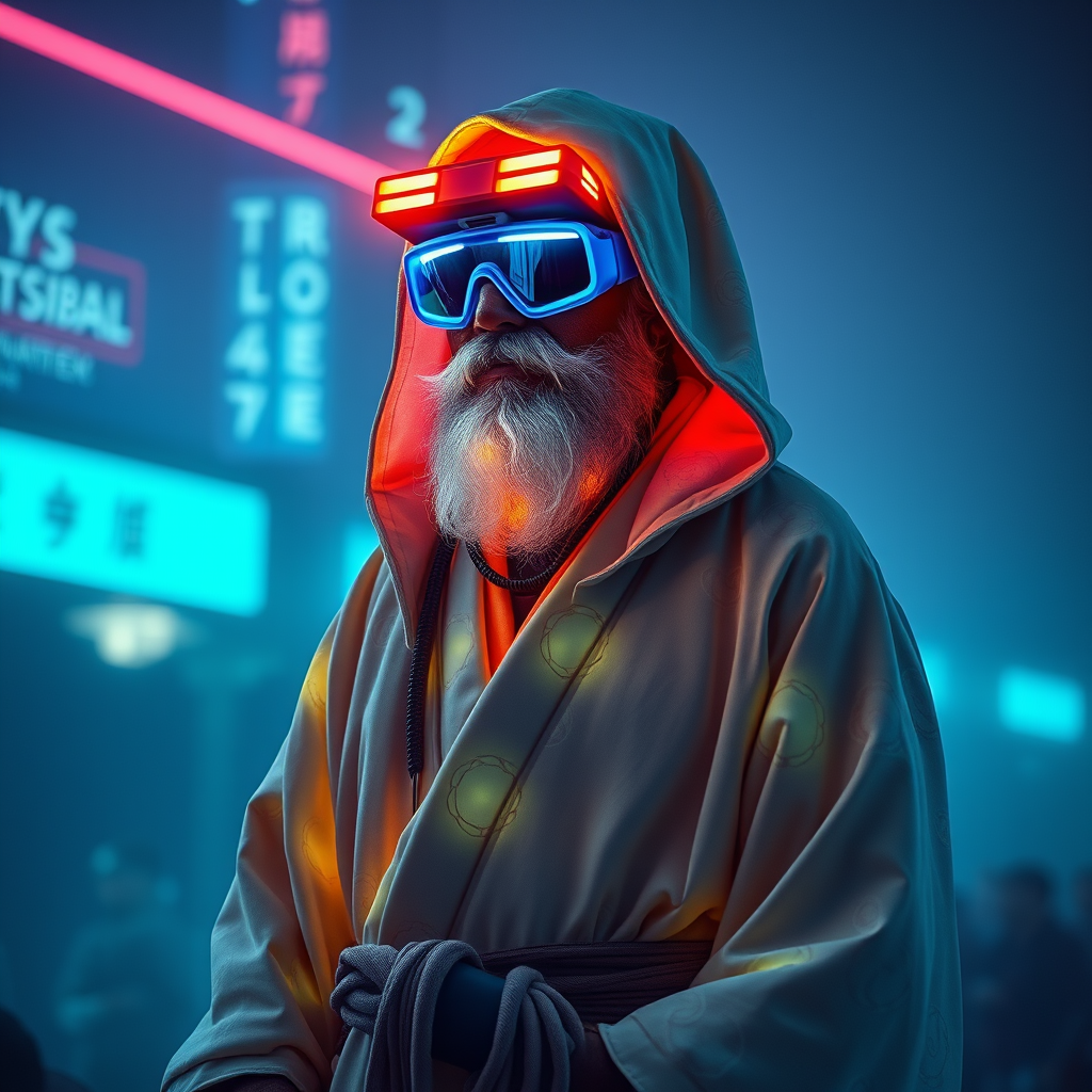 A zen roshi bounty hunter clad in ethereal zen robes integrated with futuristic scifi elements, adorned with luminescent AR goggles that emit a soft, mystical glow. The robes feature intricate patterns that pulse gently, echoing the hunter's meditative aura amidst a neon-lit digital landscape. The bounty hunter stands poised, merging ancient wisdom with advanced technology, embodying a serene yet formidable presence. Hyper-realistic textures capture the blending of zen tranquility with cutting-edge innovation, surrounded by an aura that shimmers with otherworldly energy in a 2:3 ratio composition, infused with chaos and harmony.