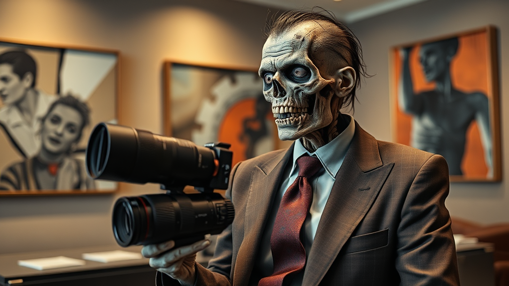A zombie, dressed in an impeccably tailored suit, exudes an air of ruthless authority as the CEO of a Fortune 500 company. His office, a surreal merging of decayed elegance and high-tech sophistication, boasts walls lined with abstract art. Holding a Sony FE 70-200mm f/2.8 GM OSS Lens, he studies his empire through hollow eyes, his undead nature subtly contrasting with the sleek, modern decor around him. His presence commands the room, a chilling portrait of power persisting beyond life.