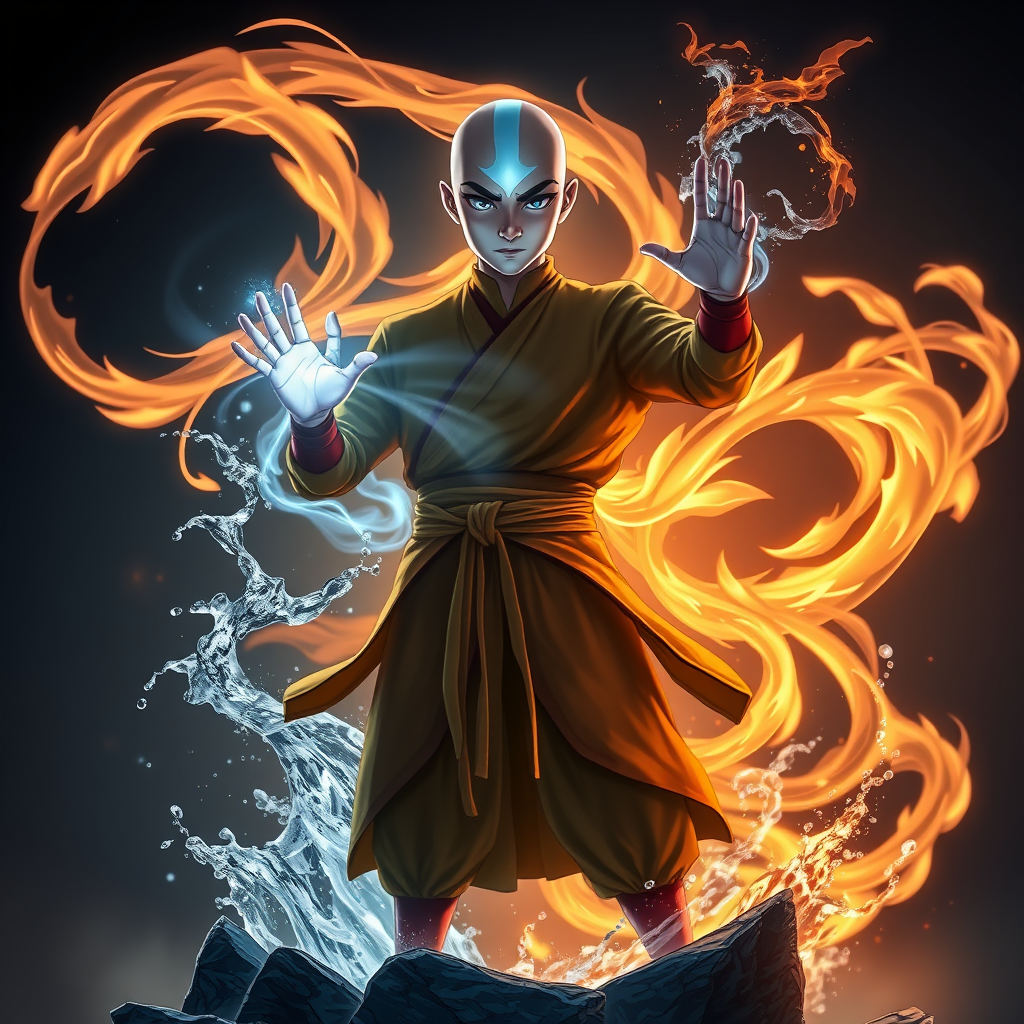 Aang stands in a powerful pose as the Avatar, his eyes and tattoos illuminated in a glowing white light, signifying his Avatar State. Around him, the elements swirl in a harmonious dance: air currents whip around his form, lifting him slightly off the ground with ethereal grace; flames flicker and coil around his hands, casting dynamic shadows across his serene face; water encircles him in fluid ribbons, droplets shimmering with an inner light; and jagged stones revolve around his feet, embodying strength and stability. His expression is a blend of tranquility and fierce determination, capturing his inner balance as the last airbender. Subtle creative touches include a faint aura of ancient Avatars in the background, and slight modifications to his traditional attire, blending traditional monk robes with modern, intricate patterns that hint at his unique journey and mastery. The scene is richly detailed, capturing every nuance of movement, light, and texture, producing a breathtaking 8k resolution image that immerses the viewer in the awe-inspiring presence of the Avatar.