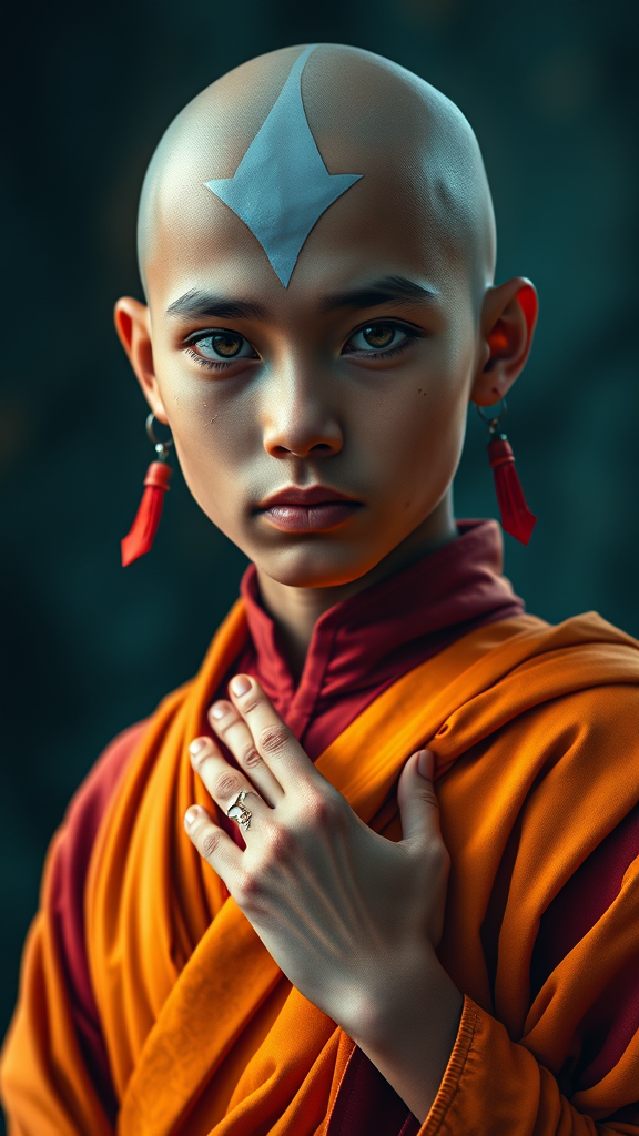 Aang, the last airbender, in the style of furaffinity, dressed in rich orange robes with red accents, #vfxfriday, massurrealism, vibrant pigmentation, spiritualcore, cinematic lighting, glowing arrow tattoos, photorealistic portrait, extremely detailed, 8k resolution, sharp focus, *excluding elements such as low quality imagery, text logos, watermarks, signatures, out of frame issues, digital artifacts, distortion or poor craftsmanship, excess limbs or digits, anatomical inaccuracies, cut-off features, awkward or impossible body positions, mismatches or irregular facial features, deformities, off-center or poorly composed visuals, duplicated elements, and especially, ill-rendered hands.*