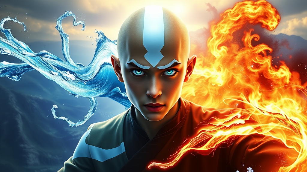 Aang, the last airbender, is depicted in an ultra-detailed, realistic scene, showcasing his mastery over all four bending elements in the powerful Avatar State. His eyes and tattoos glow with an ethereal white light, indicating his heightened spiritual power. Air currents swirl around him with vibrant energy, while streams of water twist and flow gracefully, reflecting shimmering blues and silvers. Fire burns with intense, dynamic reds and oranges, casting a warm, flickering glow across his form. Earth rises and hovers with a rich array of browns and greens, embodying strength and stability. Aang’s expression is one of serene determination, his bald head and arrow tattoos further enhancing his iconic appearance. The scene is set against the backdrop of a breathtaking landscape, where the elements collide harmoniously, emphasizing his role as the bridge between worlds. Small creative modifications show additional spirit energy flickering around him, incorporating faint hues of purple and gold, symbolizing the mystical nature of the Avatar.