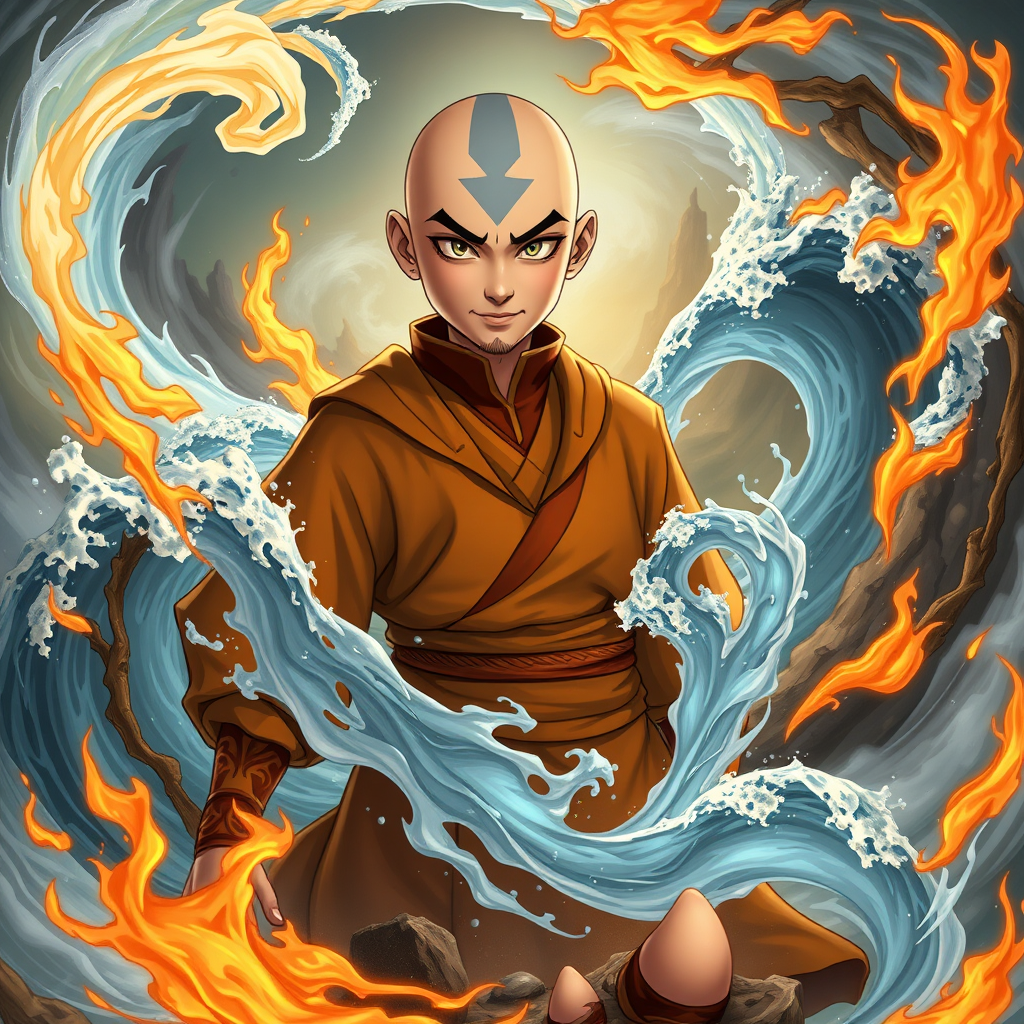 Aang, the last airbender, stands amidst a swirling vortex of elemental power, embodying the Avatar State in all its glory. His eyes and tattoos glow with an ethereal, piercing light, symbolizing his connection to the vast wisdom of past Avatars. Surrounding him, the elements dance in harmony: spiraling gusts of air form intricate patterns around his figure, while waves of water rise and swirl in graceful arcs. Flames leap and flicker with intense energy, casting a warm glow that contrasts with the cool blues of flowing water. Earthy tendrils rise from the ground, solid and steadfast, encircling him as if shielding him from unseen forces. The environment around Aang is a blend of serene natural beauty and chaotic energy, reflecting both his inner peace and the immense power he wields. His expression is one of calm determination, lips set in a slight, knowing smile as if he is aware of the balance he must maintain between destruction and protection. His attire, while traditional, features subtle enhancements, such as intricate patterns on his robes that echo the symbolic nature of each element. The overall scene captures the awe-inspiring essence of the Avatar State, with ultra-realistic detail and vivid, high-definition colors emphasizing the dynamic interaction of the elements around him.