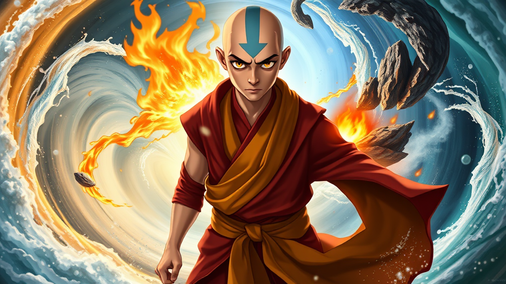 Aang, the last airbender, stands at the center of a swirling vortex of elemental power, each element vividly portrayed in astounding detail. His eyes and tattoos glow a bright, intense light as he enters the Avatar State, exuding an aura of ancient wisdom and supreme control. Around him, water curves in graceful arcs, with intricate ripples capturing the light as though each drop were meticulously painted. Flames roar with a fierce intensity, their incandescent tongues dancing in dynamic patterns that suggest both destruction and rebirth. Earth levitates in rugged, jagged chunks, reflecting a balance of immense strength and firm stability, while faint dust motes capture the play of shadows and light. Air currents encircle Aang, their ethereal presence made visible through swirling clouds and the gentle bending of surrounding grasses and leaves, demonstrating the fluid grace of motion. Aang’s expression is one of serene concentration, wisdom in his eyes as he effortlessly manipulates the forces around him. His iconic maroon and yellow robe flows elegantly, rippling in response to the elements, and his staff, a symbol of his nomadic heritage, is held confidently in one hand. The scene is set against a backdrop of towering mountains and lush forests, illuminated by the soft, golden hues of a setting sun, casting long, dramatic shadows that amplify the grandeur of this moment. Small creative changes blend seamlessly into the core concept, adding unique textures to the elements and slight variations in Aang’s attire that honor the original while introducing fresh artist interpretations.
