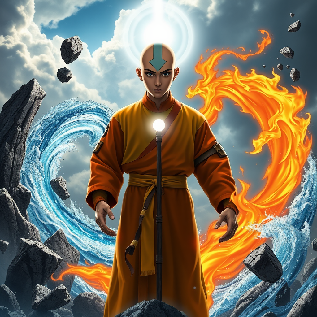 Aang, the last airbender, stands at the center of a swirling vortex of elemental forces, showcasing his unparalleled mastery of earth, water, fire, and air while in the imposing and powerful Avatar State. His eyes and tattoos glow with a brilliant, ethereal light, radiating energy and authority. He stands poised and focused, his expression calm yet determined. Around him, jagged rocks levitate, forming protective circles reminiscent of ancient, mystical runes. Torrents of water weave gracefully through the air, their fluid forms blending seamlessly with the whirling gusts of wind that rustle his robes, which flutter dynamically. Flames dance around Aang with vibrant intensity, casting dancing shadows on his serene yet powerful visage. His staff hovers nearby, energized by his sheer command of the elements. The scene is set against a dramatic sky, with clouds parting to reveal a holy celestial aura that mirrors the radiance emanating from Aang himself, underscoring the legendary status of the Avatar. The setting is a harmonious blend of nature's raw power and Aang's inner peace, capturing the essence of his role as a bridge between worlds, all conveyed in ultra-detailed, high-definition 8k resolution.