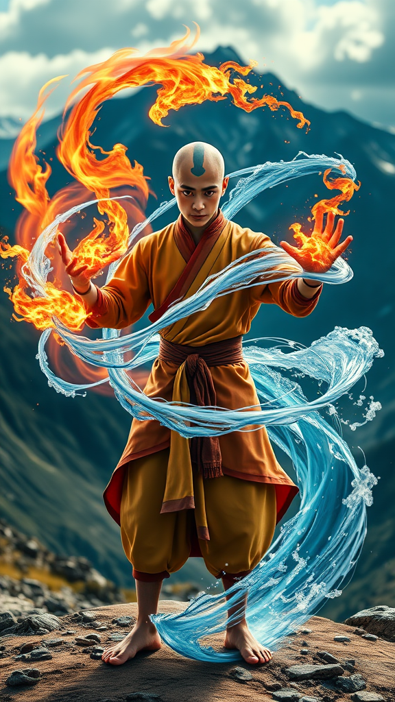 Aang, the last airbender, stands in a dynamic pose, embodying the mastery of all four bending elements in the powerful Avatar State. His eyes and tattoos glow intensely, indicative of his heightened power. Surrounding him, swirling elements create a stunning vortex: flames dance fiercely around his hands, water whips and coils gracefully from his movements, earth shards orbit protectively around his form, and a powerful gust of wind whirls around his feet, lifting him slightly off the ground. His air nomad robes flutter dramatically, enhanced by a subtle shimmer that suggests a connection to the spirit world. Despite the overwhelming display of elemental power, Aang’s expression remains serene and focused, emphasizing his control and inner peace. The setting is a breathtaking natural landscape, with mountains and skies in the background that highlight the scale and majesty of his presence. The overall scene captures a sense of harmony and balance, showcasing Aang as a beacon of hope and strength.